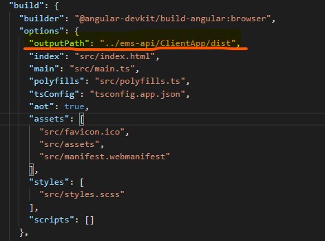 - Update the outputPath in our angular.json file, so the build will always be placed under the Client\dist folder inside WebApi. (we will use this approach)