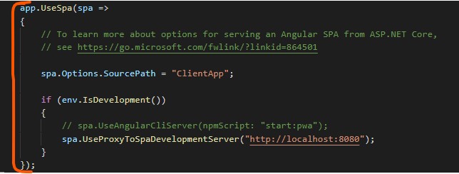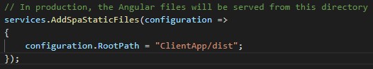 Let’s add these statements inside the ConfigureServices method so that the Asp.NET Core SPA middleware can serve the static files from the ClientApp/dist folder.